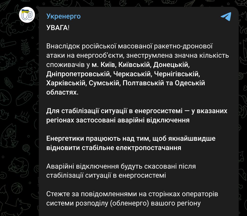 За даними місцевої влади, аварійні відключення світла розпочалися у Києві, Харкові, Полтавській та Сумській областях.