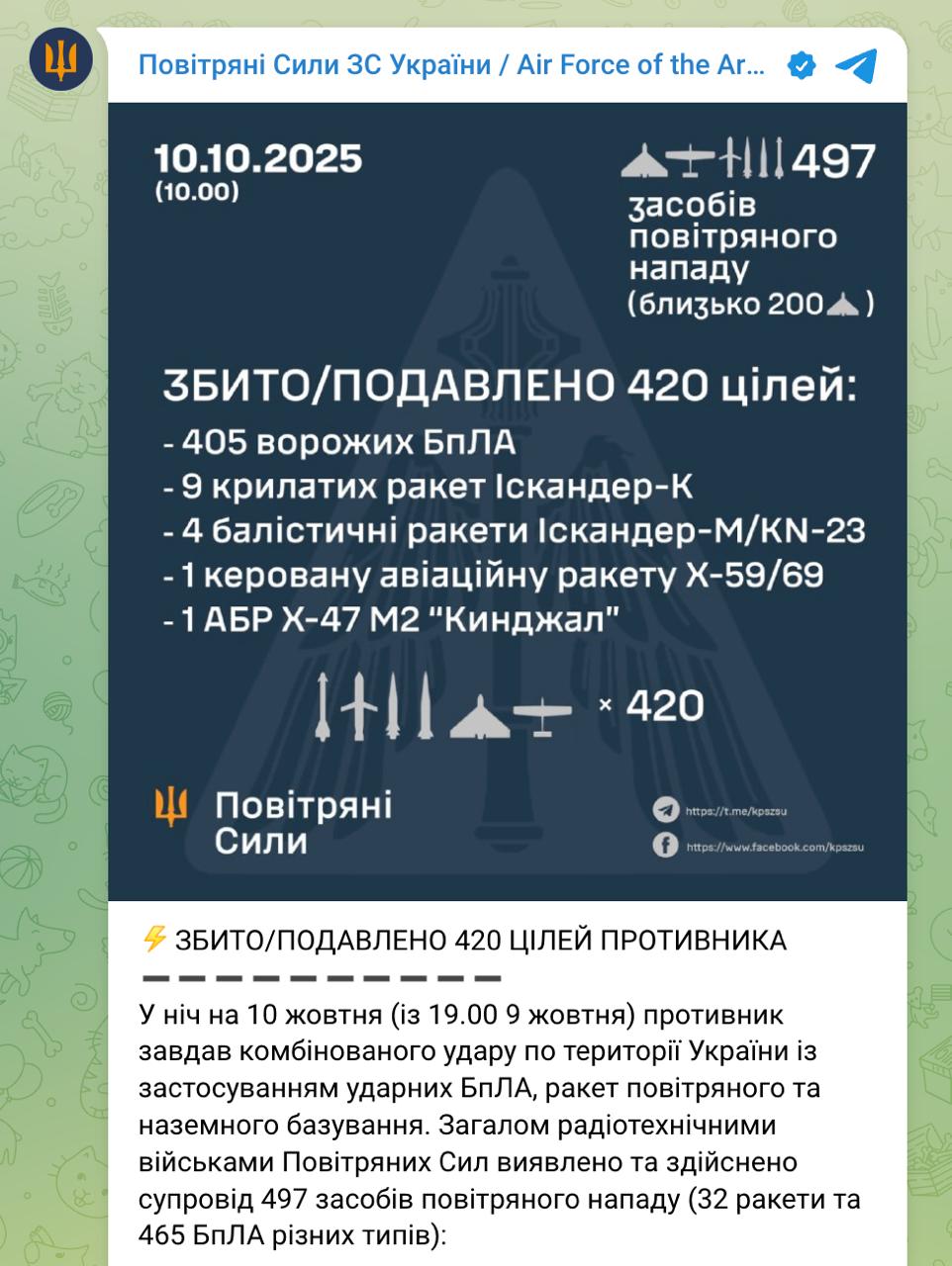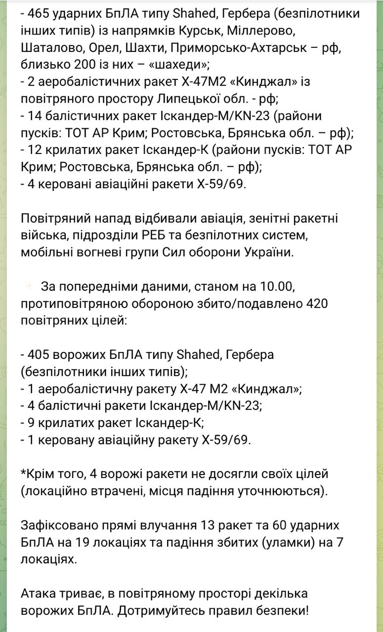 10:23 В Україні вночі запустили 497 повітряних цілей, було 73 прильоти, повідомляють Повітряні сили.