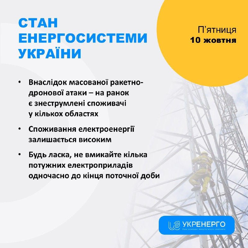 За інформацією Укренерго, також відключення світла продовжують діяти в Києві, Київській, Сумській, Чернігівській, Харківській, Полтавській, Дніпропетровській, Донецькій та Запорізькій областях.