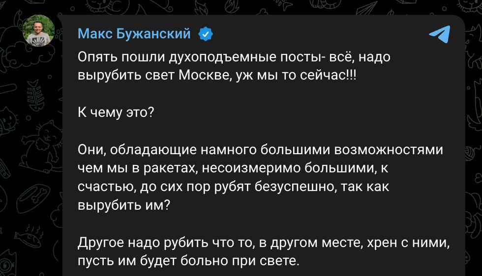 "Знову пішли духопідйомні пости: все, треба вирубати світло Москві, вже ми зараз! До чого це? Вони, які мають набагато більші можливості, ніж ми, в ракетах, незрівнянно більшими, на щастя, досі рубають безуспішно, так як вирубати їм?" – написав "слуга народу" Максим Бужанський.