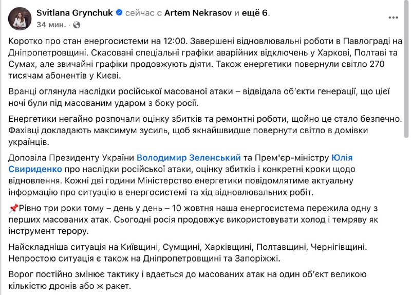 13:17 У Дніпропетровській, Сумській та Харківській областях вдалося покращити ситуацію зі світлом, але загалом відключення продовжуються у 10 регіонах, як і було вранці, повідомляє Міненерго.