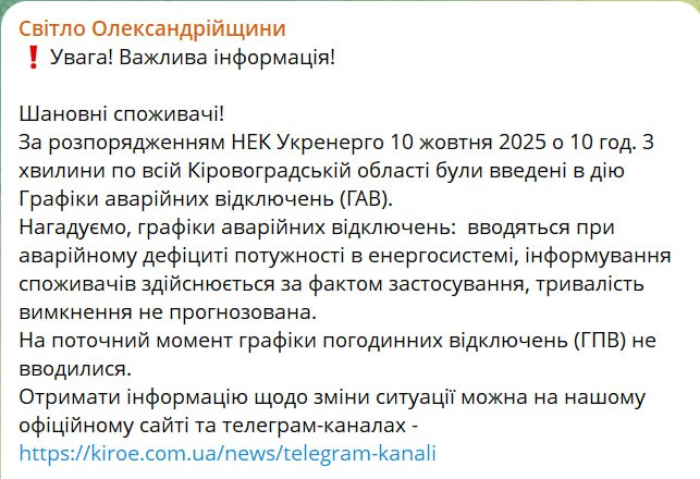 19:27 На Кіровоградщині введено графіки відключень світла, повідомляє Кіровоградобленерго.