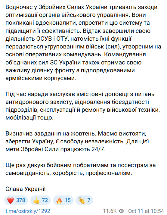 "Завершили свою діяльність ЗСУВ та ОТУ, їх функції передаються угрупованням військ (сил), утвореним на основі оперативних командувань. Командування об'єднаних сил ЗС України отримає свою важливу ділянку фронту з підлеглими армійськими корпусами", - пише Сирський.