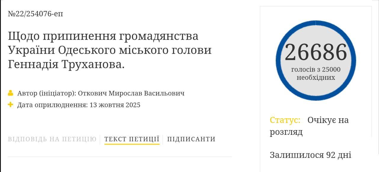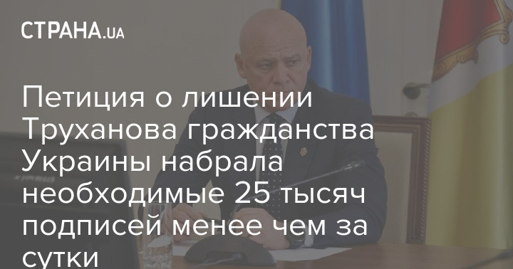 Петиція з вимогою позбавити громадянства України мера Одеси Геннадія Труханова менш як за добу набрала понад 25 тисяч підписів, необхідних для розгляду президентом Володимиром Зеленським.
