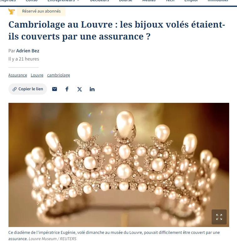 Вкрадені з Галереї Аполлона в Луврі коштовності не були застраховані, бо постійна страховка у складі постійної домашньої експозиції, а не на виїзних виставках, коштувала б державі надто дорого.