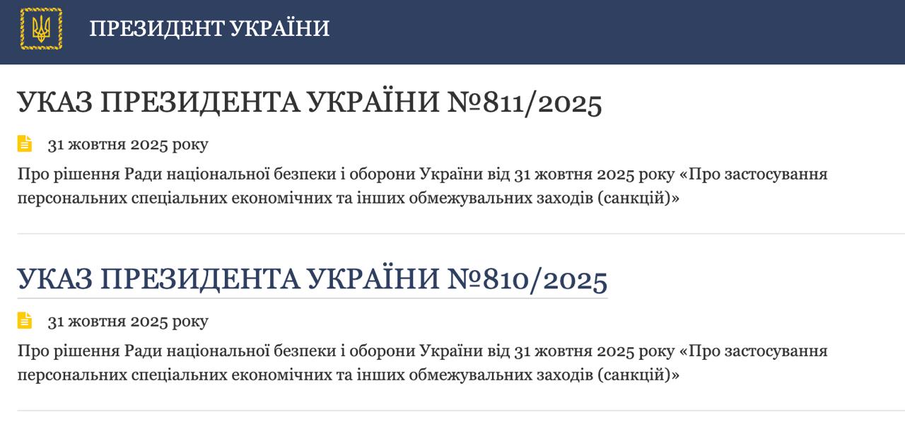 Президент України Володимир Зеленський підписав два укази щодо введення в дію рішень Ради національної безпеки та оборони України щодо застосування персональних, спеціальних економічних та інших обмежувальних заходів.