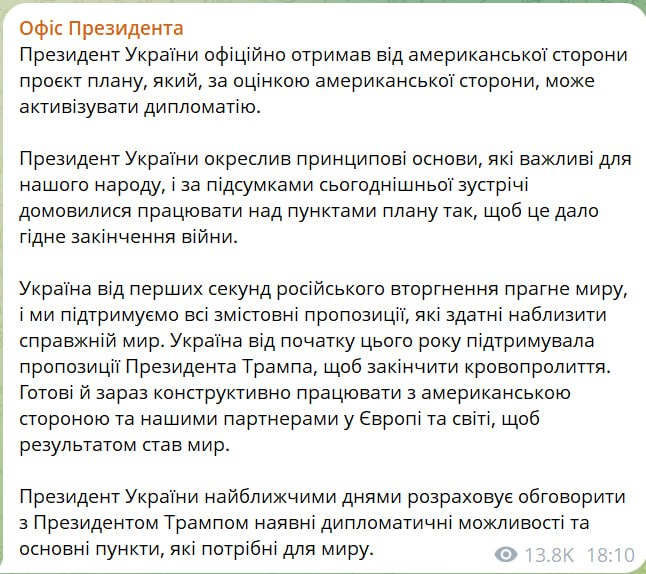 Президент України Володимир Зеленський офіційно одержав від американської сторони проект плану, який, за оцінкою американської сторони, може активізувати дипломатію.