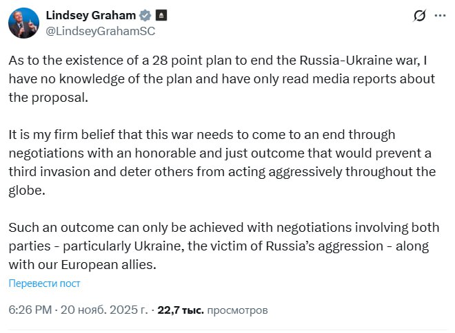 "Що стосується існування плану з 28 пунктів з припинення російсько-української війни, то я нічого не знаю про цей план і тільки читав повідомлення ЗМІ про цю пропозицію. Я твердо переконаний, що ця війна повинна бути припинена шляхом переговорів з гідним і справедливим результатом, який запобігатиме третім вторгненням і може запобігти третім вторгненням. бути досягнутим лише шляхом переговорів за участю обох сторін, особливо України, яка стала жертвою російської агресії, а також наших європейських союзників”, – написав Грем.