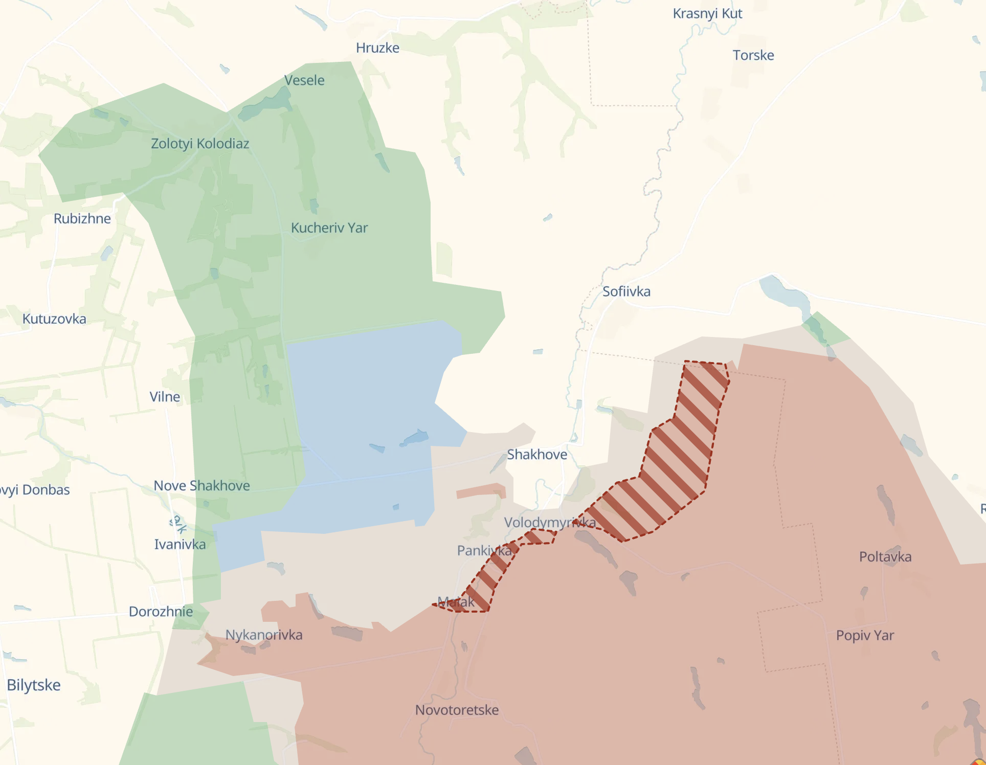 Хоча карта цього не відображає, але Покровська повністю втрачено, заявив український військовий Владислав Потоцький після виходу з міста. Коридор для виходу з цієї ділянки вже менше двох кілометрів.