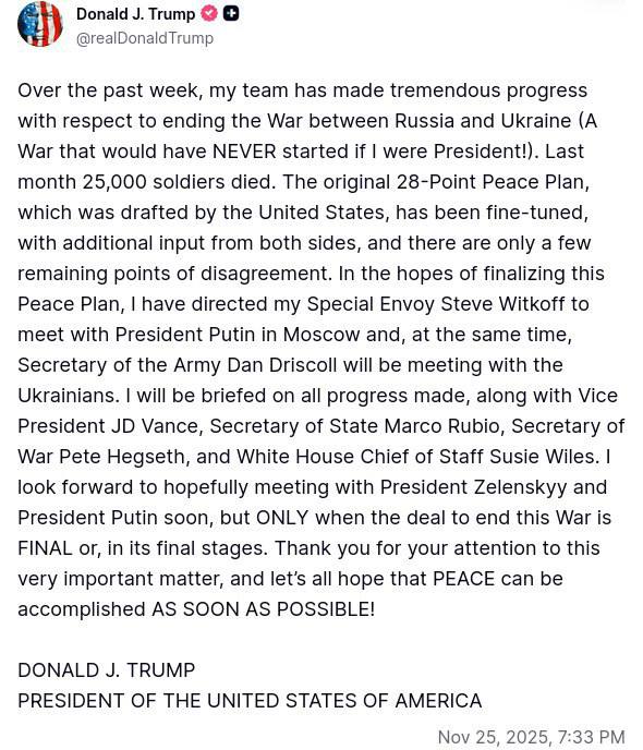 "За останній тиждень моя команда досягла величезного прогресу щодо припинення війни між Росією та Україною (війна, яка ніколи б не почалася, якби я був президентом!). Минулого місяця загинули 25 000 солдатів. Початковий мирний план з 28 пунктів, який був розроблений Сполученими Штатами, був доопрацьований з додаткових розбіжностей. У надії завершити мирний процес я доручив своєму спеціальному посланнику Стіву Уіткоффу зустрітися з президентом Путіним у Москві, і в той же час міністр армії Ден Дрісколл зустрінеться з українцями. Хегсетом і начальником штабу Білого дому Сьюзі Уайлс. – написав президент США у своїй соцмережі.