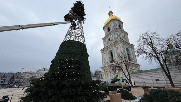 У Києві розпочали встановлювати головну новорічну ялинку країни. Вона буде на Софійській площі.