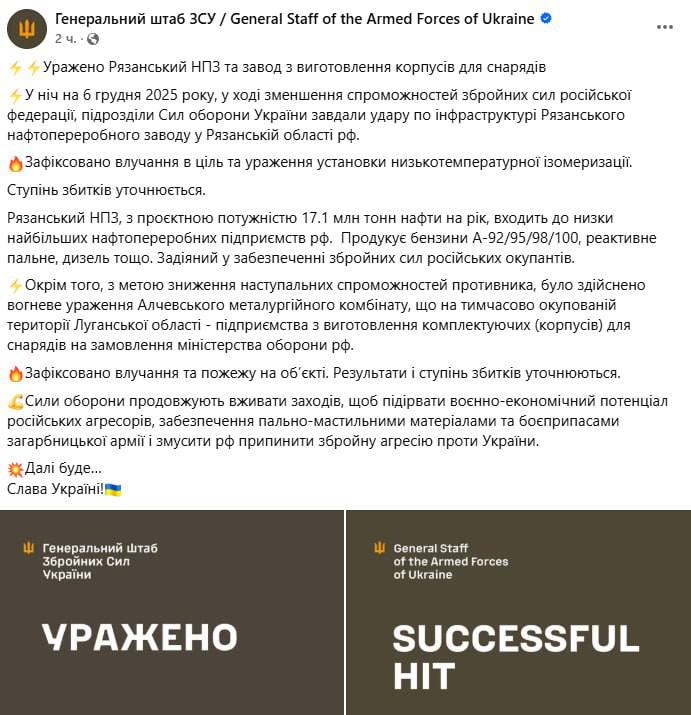 За інформацією відомства, у ніч проти 6 грудня Сили оборони України завдали удару по інфраструктурі Рязанського нафтопереробного заводу в Рязанській області. Зафіксовано попадання в ціль та ураження установки низькотемпературної ізомеризації. Зазначається, що Рязанський НПЗ з проектною потужністю 17,1 млн тонн нафти на рік входить до найбільших нафтопереробних підприємств РФ.
