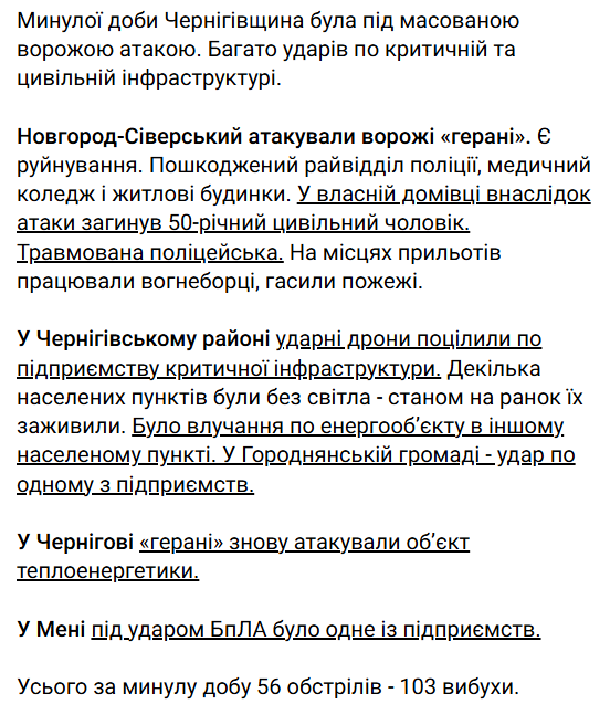 При цьому під масованим ударом опинилася й Чернігівщина. За даними голови Чернігівської ОДА В'ячеслава Чауса, у Новгороді-Сіверському ударні БПЛА типу "Герань" пошкодили райвідділ поліції, медичний коледж та житлові будинки.