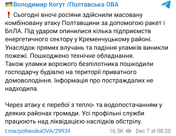 У ніч проти 7 грудня армія РФ завдала масованого удару по Кременчуку в Полтавській області.