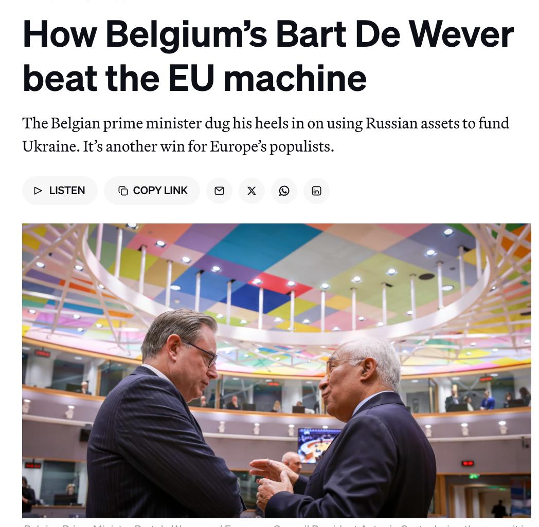 За інформацією видання, незважаючи на те, що Бельгія понад два роки послідовно блокувала використання російських активів для фінансування України, за кілька годин до вчорашнього саміту більшість країн ЄС очікували, що Брюссель останнім часом відступить. За словами одного із дипломатів, напередодні саміту прем'єр Бельгії Барт де Вевер "по суті отримав усе, чого хотів".