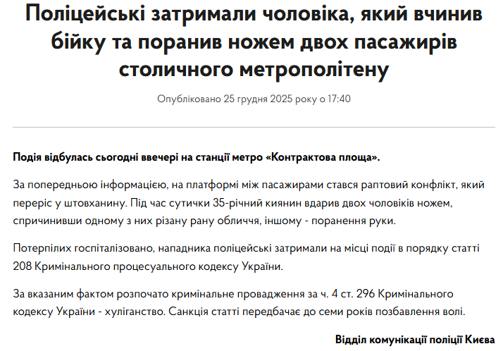 Увечері 25 грудня у Києві на станції метро "Контрактова площа" стався конфлікт між пасажирами, під час якого один з них дістав ножа та завдав поранень двом людям.
