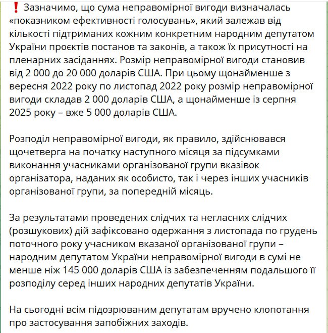 "При цьому щонайменше з вересня 2022 по листопад 2022 р. розмір неправомірної вигоди становив 2 000 доларів США, а щонайменше з серпня 2025 року - вже 5 000 доларів США", - йдеться в повідомленні.