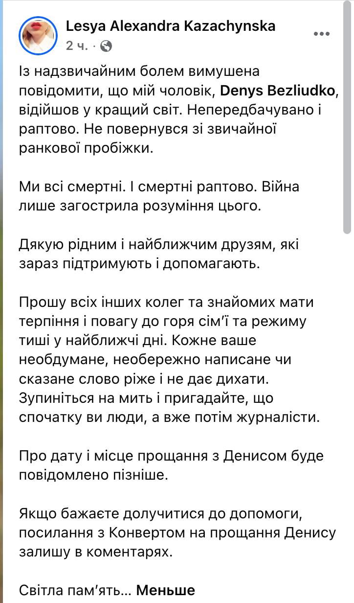"З надзвичайним болем змушена повідомити, що мій чоловік, Денис Безлюдько, відійшов у найкращий світ. Непередбачувано та раптово. Не повернувся зі звичайної ранкової пробіжки", - написала Леся Казачинська.