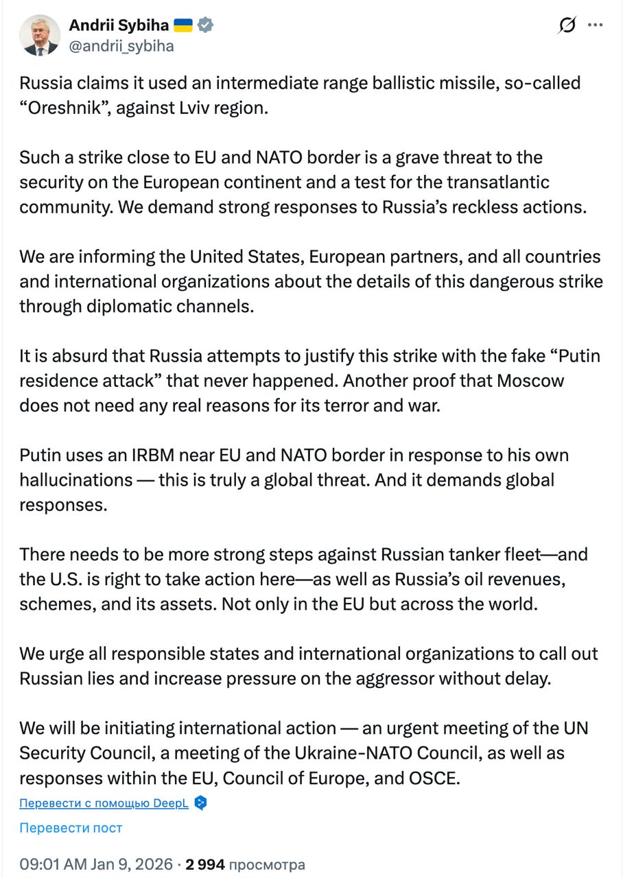 "Такий удар поблизу кордону ЄС і НАТО становить серйозну загрозу безпеці європейського континенту і є випробуванням для трансатлантичного співтовариства. Ми вимагаємо рішучих заходів у відповідь на безрозсудні дії Росії. Ми інформуємо Сполучені Штати, європейських партнерів, а також усі країни та міжнародні організації про деталі цього небезпечного удару по дипломатичних каналах. Безпеки ООН, засідання Ради Україна-НАТО, а також заходи у відповідь у рамках ЄС, Ради Європи та ОБСЄ", - написав міністр.