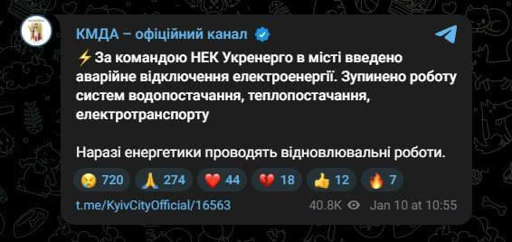 Причиною названо те, що, за розпорядженням Укренерго, у Києві та області запроваджено аварійні відключення світла.