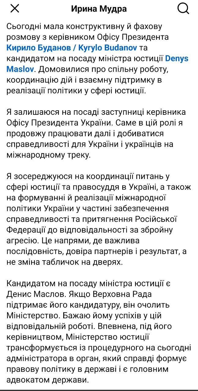 "Упевнена, під його (Маслова - Ред. ) керівництвом Міністерство юстиції трансформується із процедурного на сьогодні адміністратора в орган, який справді формує правову політику в державі і є головним адвокатом держави", - написала Мудрая.