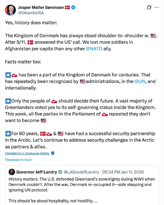 "Історія має значення. США захищали суверенітет Гренландії під час Другої світової війни, поки Данія була не в змозі. Після війни Данія знову окупувала її, обійшовши стороною і проігнорувавши протокол ООН. Йдеться про гостинність, а не про ворожість", - сказано в публікації Лендрі.