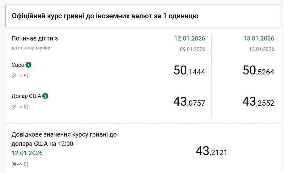 За підсумками сьогоднішніх торгів НБУ встановив на завтра, 13 січня, свій офіційний курс гривня/долар на новому історичному максимумі 43,2552 грн/$(плюс 18 копійок за день), а гривня/євро - 50,5264 грн/€ (плюс 38 копійок). Імпульсу євровалюті додало її подорожчання на світовому ринку з 1,1643 до 1,1691.