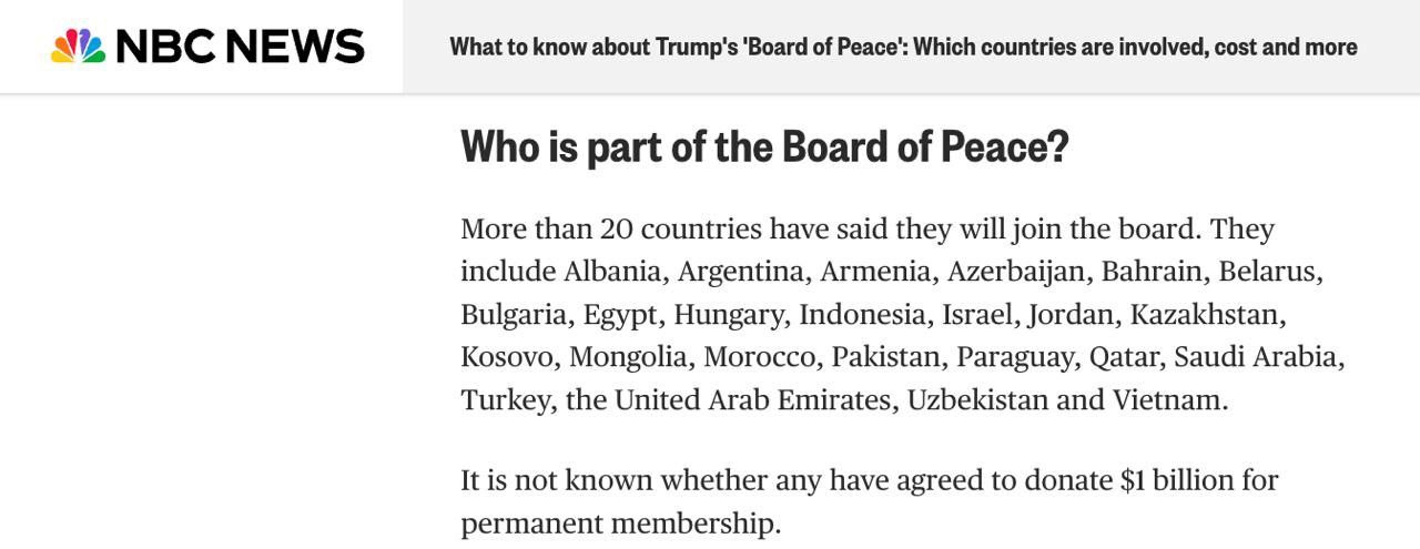 Також не виключено входження до ради Росії, особливо після того, як Трамп погодився на пропозицію Володимира Путіна сплатити внесок за рахунок заморожених у США російських активів. Цю тему ще обговорюватимуть сьогодні та завтра на переговорах в Абу-Дабі. Конкретні прогнози про їх результати робити поки що зарано: не виключено, що питання внеску ув'яжуть із переговорами про Україну, які просуваються важко.