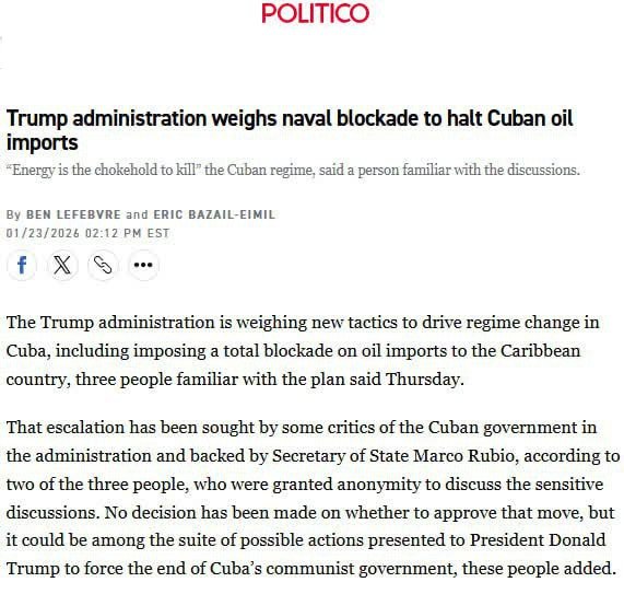 За інформацією видання, у Білому домі розглядають нові тактики для здійснення зміни режиму на Кубі, включаючи запровадження повної блокади імпорту нафти до цієї карибської країни.