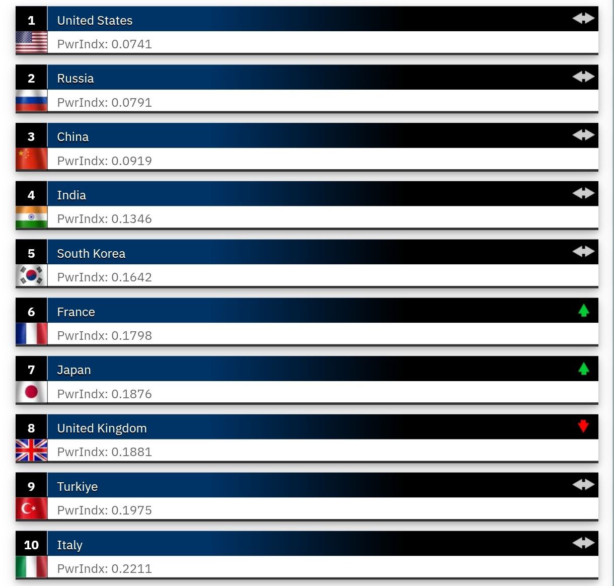 Перші три позиції у списку, як і раніше, посіли США, Росія та Китай.