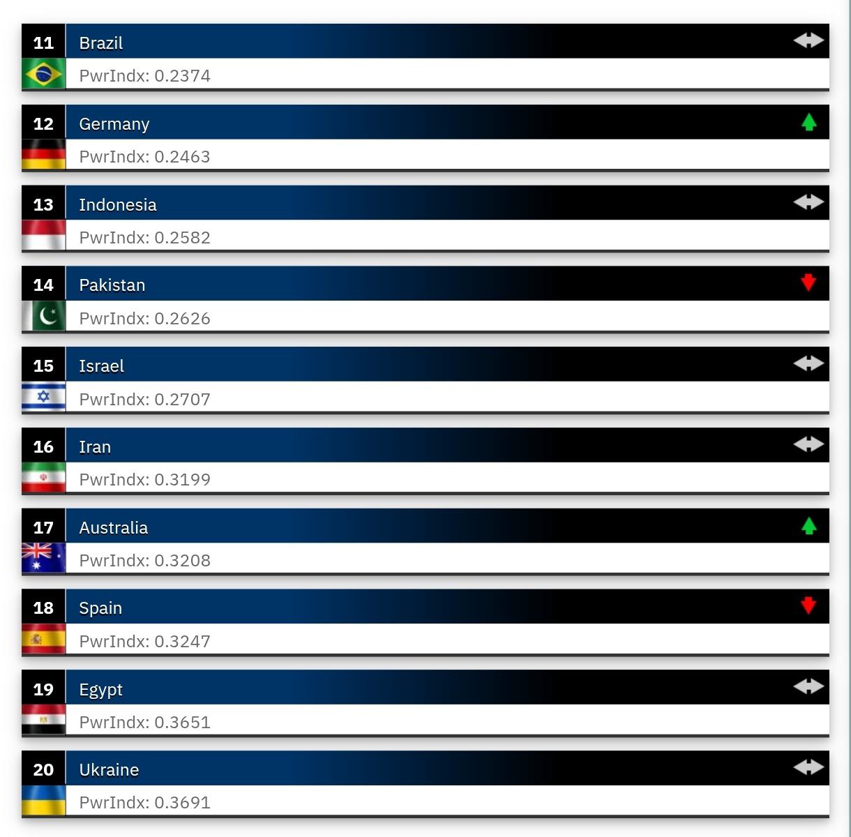 У підсумковому рейтингу Україну випередили, зокрема, Єгипет, Бразилія, Індонезія та Іран, а також Німеччина та Іспанія, незважаючи на те, що їхні армії за чисельністю значно менші за українську.