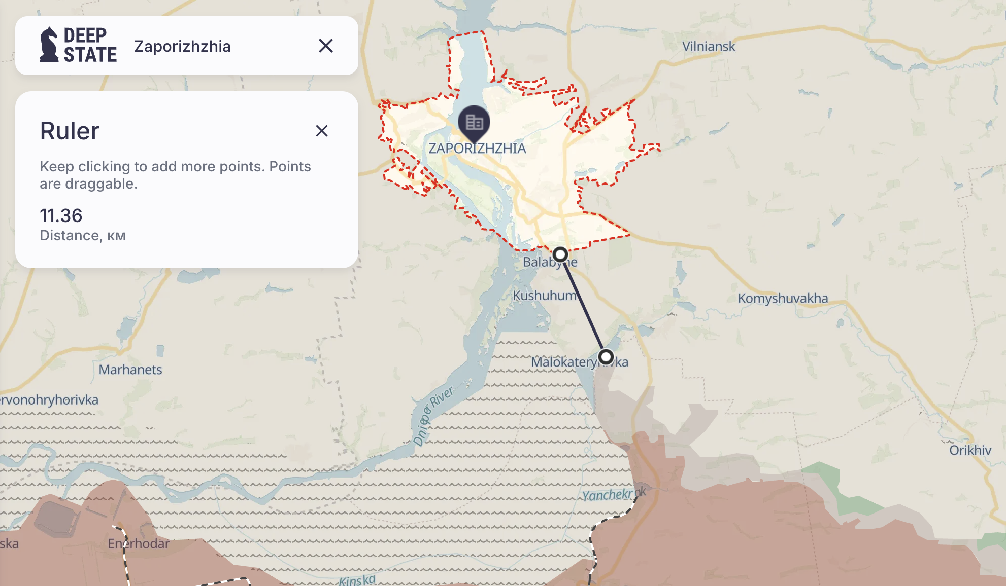 Зазначимо, що це відповідає українським даним. Судячи з карти Deep State, від "сірої зони" у райні Приморського та річки Конка по прямій до південних околиць обласного центру навіть менше 12 км.