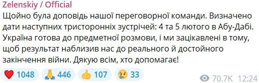 "Щойно була доповідь нашої переговорної команди. Визначено дати наступних тристоронніх зустрічей: 4 та 5 лютого в Абу-Дабі. Україна готова до предметної розмови, і ми зацікавлені в тому, щоб результат наблизив нас до реального та гідного завершення війни", - пише Зеленський.