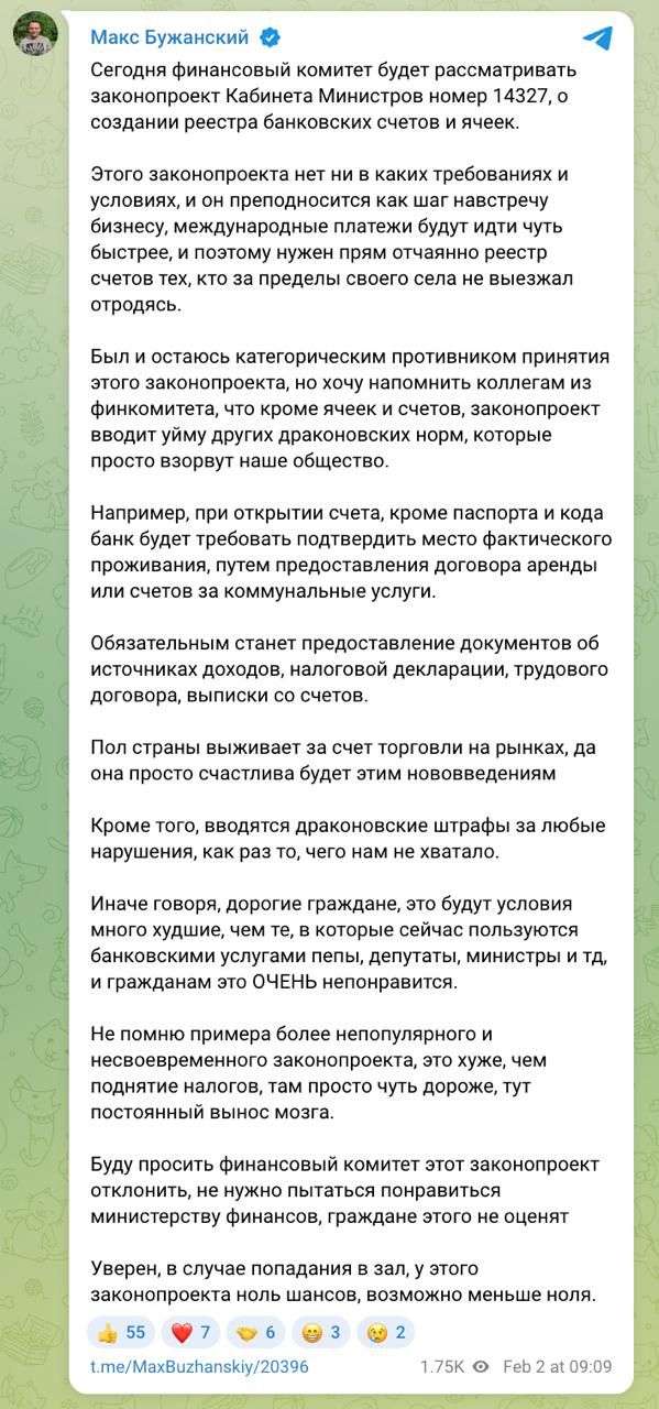 Як повідомляє у своєму телеграм-каналі народний депутат Максим Бужанський, таку норму закладено в урядовий законопроект №14327 про створення реєстру банківських рахунків та осередків, який сьогодні розгляне комітет Верховної Ради з питань фінансів, податкової та митної політики.