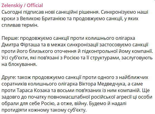 Президент України Володимир Зеленський заявив про продовження санкцій проти бізнесмена Дмитра Фірташа, а також про запровадження санкцій проти "його близького оточення та підконтрольної йому компанії".