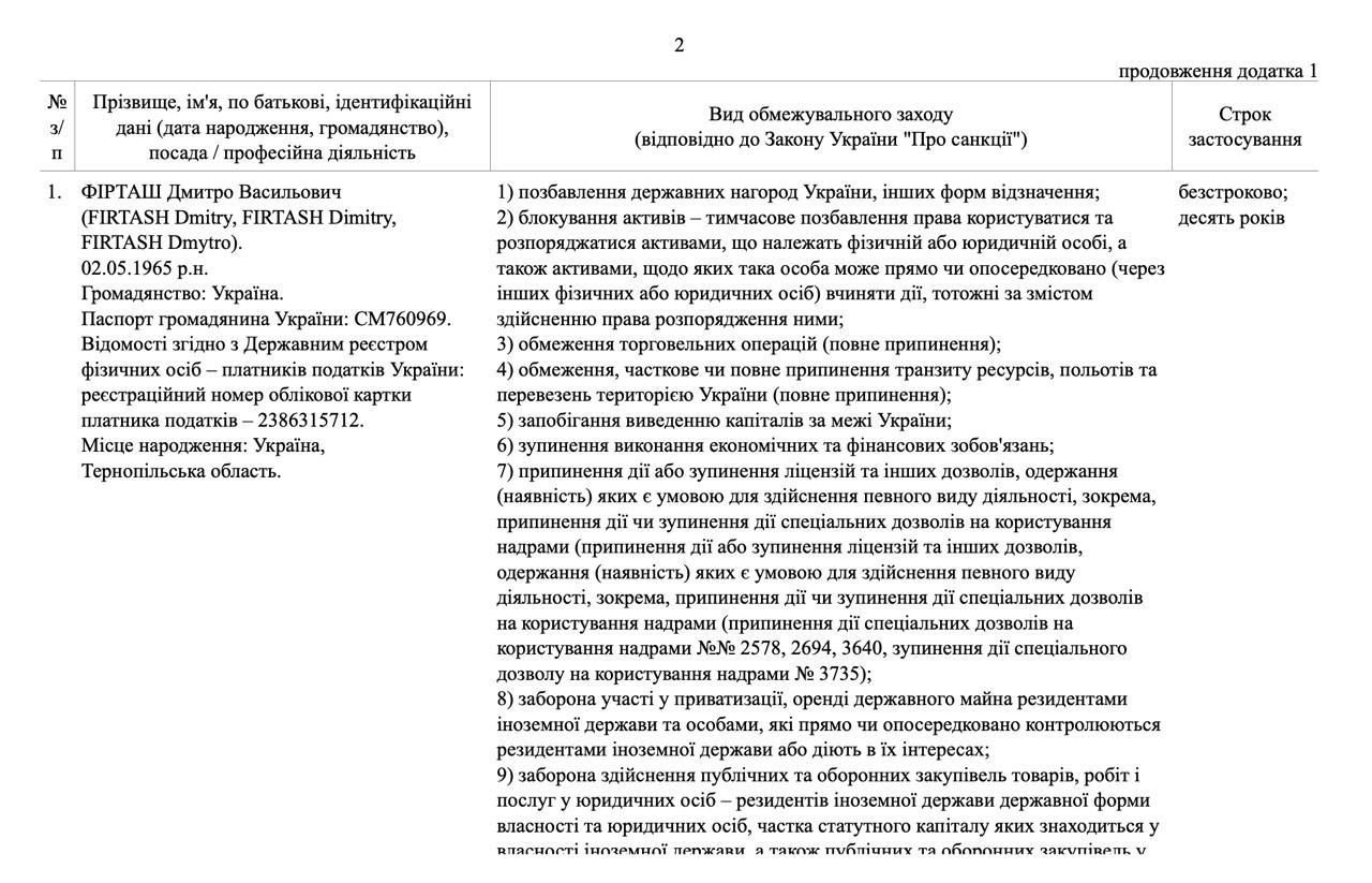 Однак у новому указі частину санкцій проти Фірташа запроваджено безстроково.
