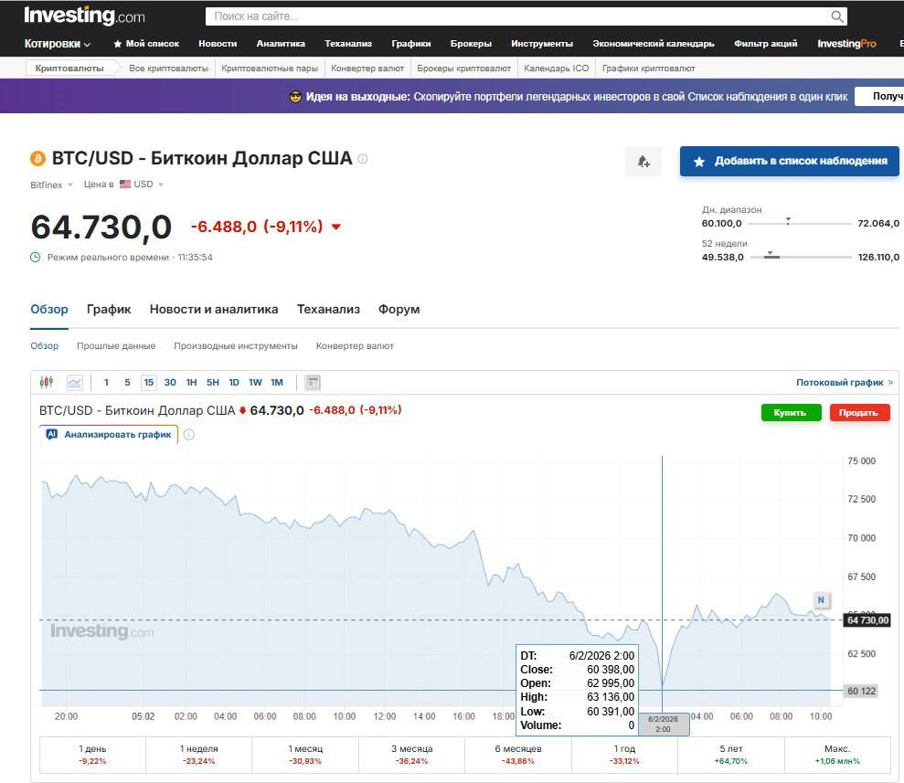 Вчора скидання біткоїну призвело до провалу його курсу на 12% — до $64 тис. за монету, а в ніч на сьогодні курс впав взагалі до $60,3 тис. Від пікової ціни $125 тисяч у жовтні 2025-го обвал виявився більш ніж дворазовим.