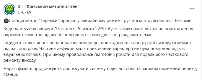 "Вчора ввечері, 15 лютого, близько 22:30, було зафіксовано локальне пошкодження окремих елементів підвісної стелі одного з виходів. Постраждалих немає. Інцидент стався через неодноразові попередні пошкодження конструкцій виходу, отримані при обстрілі. Частина дефектів носила прихований характер і не була помітна під час віз. частковому ремонту виходу. Наразі фахівці продовжують обстежити систему підвісної стелі та підземний перехід станції", - сказано в публікації про "Теремки".