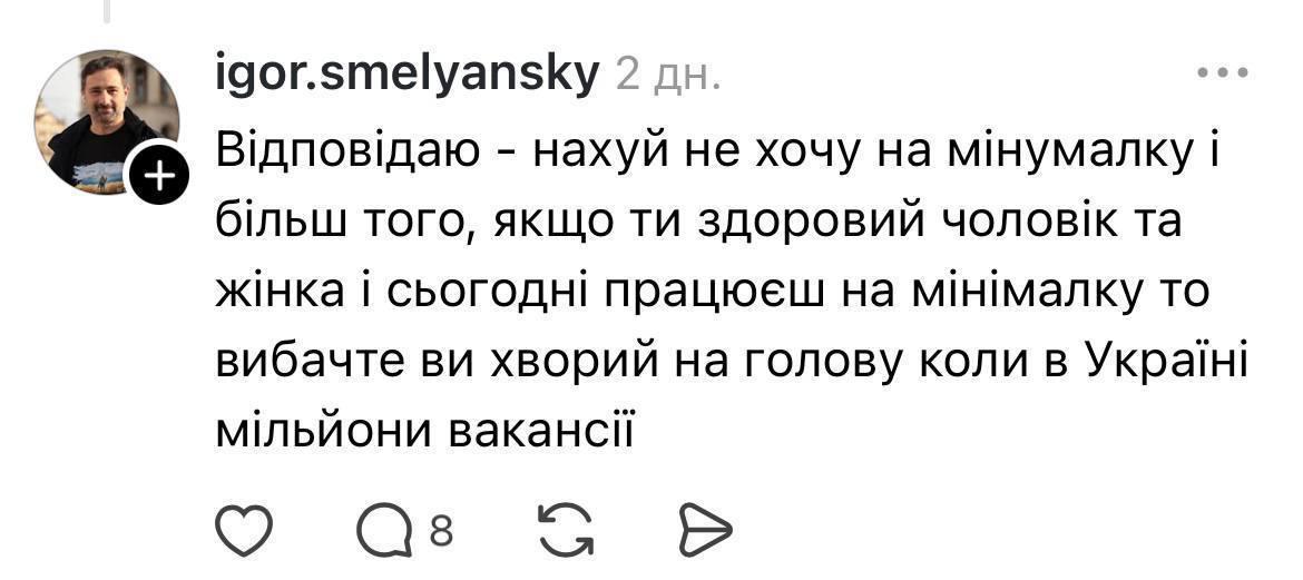 "Відповідаю: на @ уй не хочу на мінумалку і більше того, якщо ти здоровий чоловік і жінка і сьогодні працюєш на мінімалку, то вибачте, ви хворий на голову, коли в Україні мільйони вакансій", - написав Смілянський.