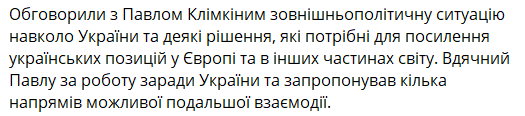 "Обговорили з Павлом Клімкіним зовнішньополітичну ситуацію навколо України та деякі рішення, необхідні для посилення українських позицій у Європі та в інших частинах світу. Вдячний Павлу за роботу заради України та запропонував кілька напрямків можливої подальшої взаємодії", - написав президент.