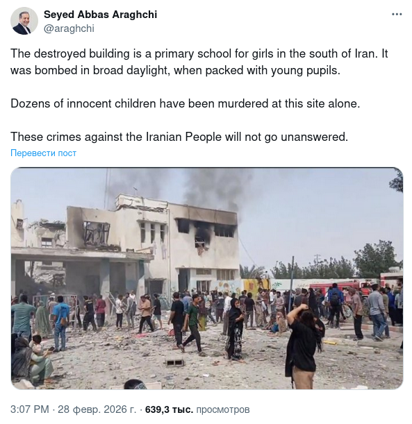 "Зруйнована будівля - це початкова школа для дівчаток на півдні Ірану. Вона була розбомблена серед білого дня, коли в ній навчалися маленькі учениці. Тільки на цьому місці було вбито десятки невинних дітей", - прокоментував удар Аракчі.