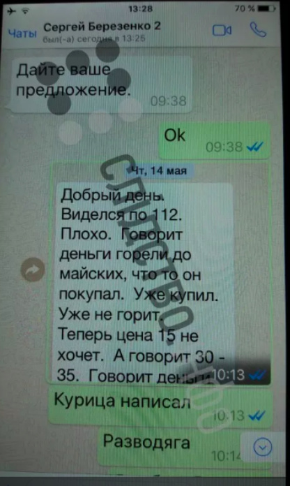 Березенко: Добрый день. Виделся по 112. Плохо. Говорит, деньги горели до майских, что-то он покупал. Уже купил. Уже не горит. Теперь цена 15 не хочет. А говорит 30-35.