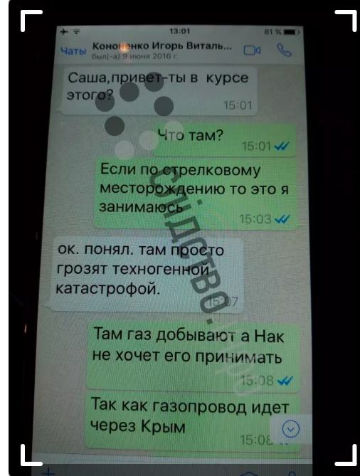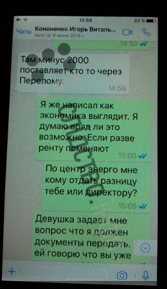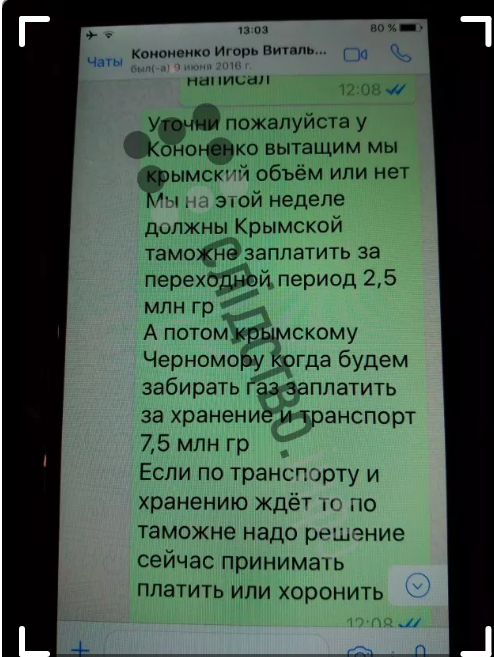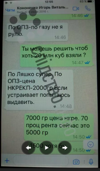 В данной переписке предположительно речь может идти о коррупционных схемах, связанных с поставками газа на предприятия, находящиеся в государственной собственности, – Одесский припортовый завод и энергогенерирующая компания "Центрэнерго". В последнем случае на скринах переписки якобы Онищенко с Кононенко речь идет о крупном откате в пользу последнего. Об этой схеме в свое время заявлял народный депутат Сергей Лещенко.