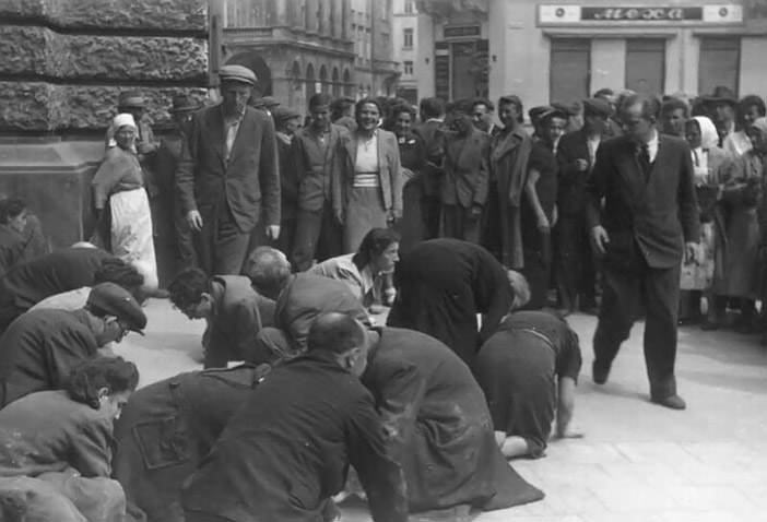 Первый день оккупации Львова, 30 июня 1941 года. Евреи на коленях чистят руками площадку перед театром на глазах у местных жителей. Архивное фото: evreimir.com