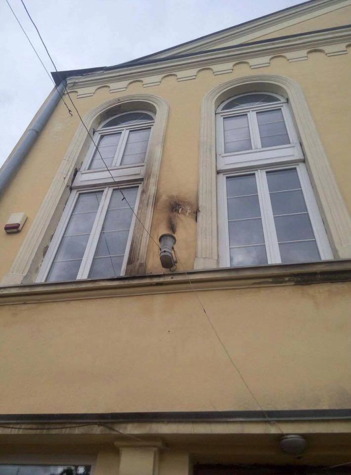 Следы от "коктейля Молотова" на синагоге во Львове, которую атаковали в июле прошлого дня в дни еврейских погромов и акций в честь Шухевича. Фото: facebook.com/eduard.dolinsky