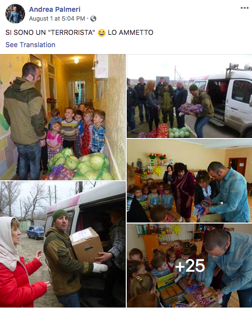Сам Пальмери на своей странице в Facebook писал, что помогает жителям Донбасса. Он публиковал фото, как развозит продукты от благотворительной организации, и с сарказмом подписал их: "Да, я террорист, признаюсь".