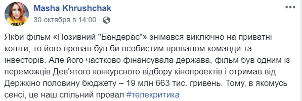 "Если бы фильм "Позывной Бандерас" снимался исключительно на частные средства, то его провал был бы личным провалом команды и инвесторов. Но его частично финансировало государство, фильм был одним из победителей Девятого конкурсного отбора кинопроектов и получил от Госкино половину бюджета - 19 млн 663 тыс. Гривен. Поэтому, в каком-то смысле, это наш общий провал", - пишет главный редактор "Телекритики" Мария Хрущак.