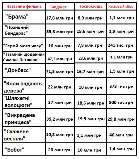 На сегодняшний день на широкие экраны за 2018 год вышло более 10 украинских киноработ, которые снимались в том числе и за госсредства. "Страна" на основе данных кинематографических веб-сайтов составила сравнительную таблицу - суммы государственного финансирования и сбора в прокате.