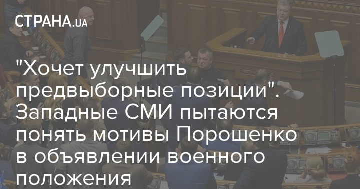 "Отечественные оппоненты непопулярного президента обвинили его в планировании использования военного положения в качестве способа приостановить выборы, намеченные на 31 марта. Но Порошенко смог заставить украинский парламент утвердить эту меру только после того, как смягчил свое предложение, уменьшив срок военного положения, которое вступило в силу в среду - до 30 с 60 дней, ограничив его приграничными регионами и обещая не откладывать выборы", - пишет Лусиан Ким, международный корреспондент NPR.