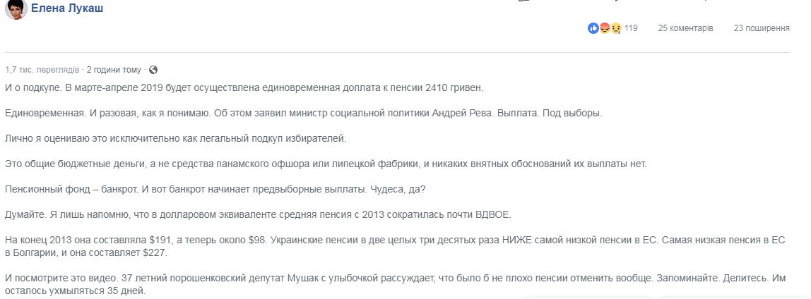 "И о подкупе. В марте-апреле 2019 будет осуществлена единовременная доплата к пенсии 2410 гривен. Единовременная. И разовая, как я понимаю. Об этом заявил министр социальной политики Андрей Рева. Выплата. Под выборы.